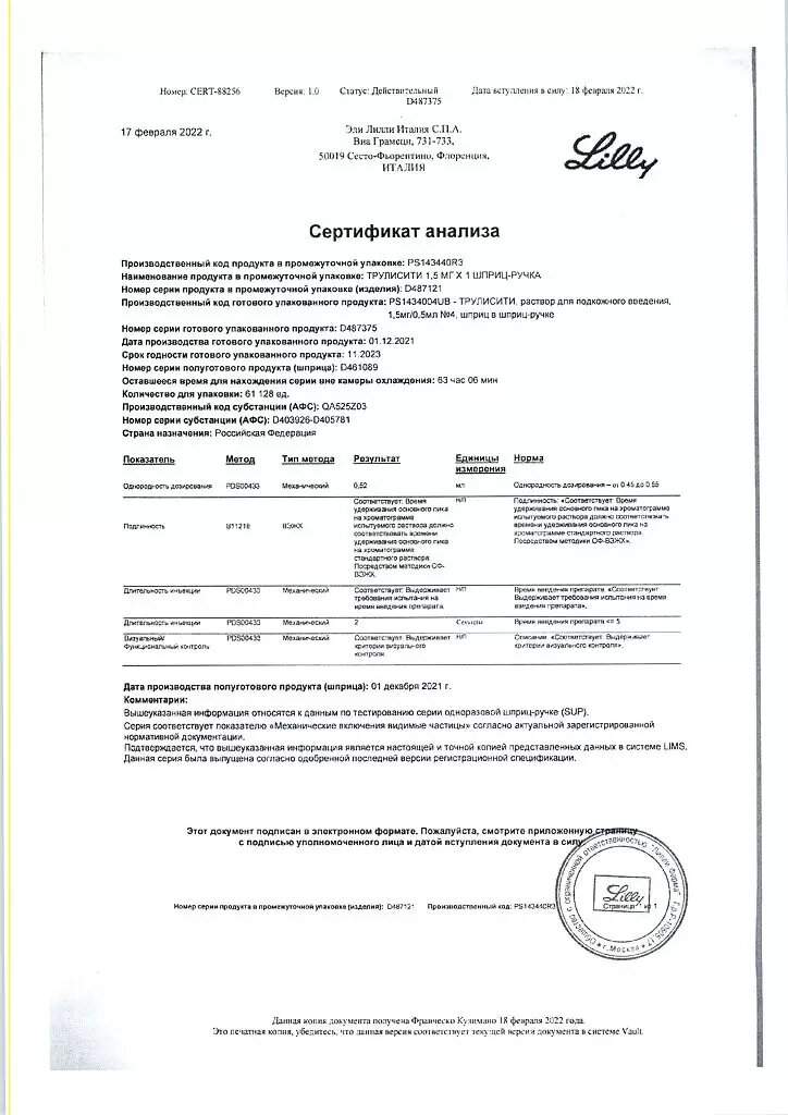 Если доза препарата Трулисити® была пропущена, ее следует ввести как можно скорее, если до введения следующей запланированной дозы осталось не менее 3 дней (72 ч). Если до введения следующей запланированной дозы остается менее 3 дней (72 ч), необходимо пропустить введение препарата и ввести следующую дозу в соответствии с графиком. В каждом случае пациенты могут возобновить обычный режим введения препарата 1 раз в неделю.