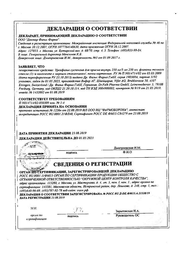 При комбинации Урсофалька и содержащих гидроокись алюминия антацидов, колестирамина, колестипола снижается системная абсорбция урсодезоксихолевой кислоты, поэтому между приемами необходим минимум двухчасовой интервал. Применение вместе с циклоспорином может менять плазменную концентрацию последнего, что может требовать коррекции его дозировки.