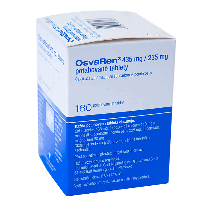 ОсваРен предназначен для лечения пациентов с хронической почечной недостаточностью. Такие пациенты не могут экскретировать фосфаты через почки в нормальных количествах, что ведет к гиперфосфатемии. Диета или элиминация фосфатов являются недостаточными мероприятиями поэтому следует использовать, фосфатсвязывающие препараты, чтобы уменьшить абсорбцию фосфатов в ЖКТ. Поскольку ацетат кальция и карбонат магния являются фосфатсвязывающими соединениями, они, совместно с фосфатами пищи, образуют плохо растворимые кальциевые и магниевые фосфатные соли, которые выводятся через кишечник. Ацетат кальция достигает своей максимальной фосфатсвязывающей способности при значениях рН 6-8. Поэтому, ОсваРен также подходит для связывания фосфата у пациентов с гипо- или анацидными состояниями.