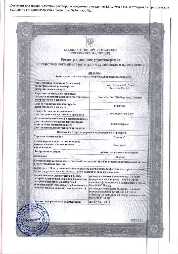 Фото Оземпик раствор для инъекций 1,34 мг/мл шприц-ручка 0,5мг/доза 4 дозы + иглы 4 шт.