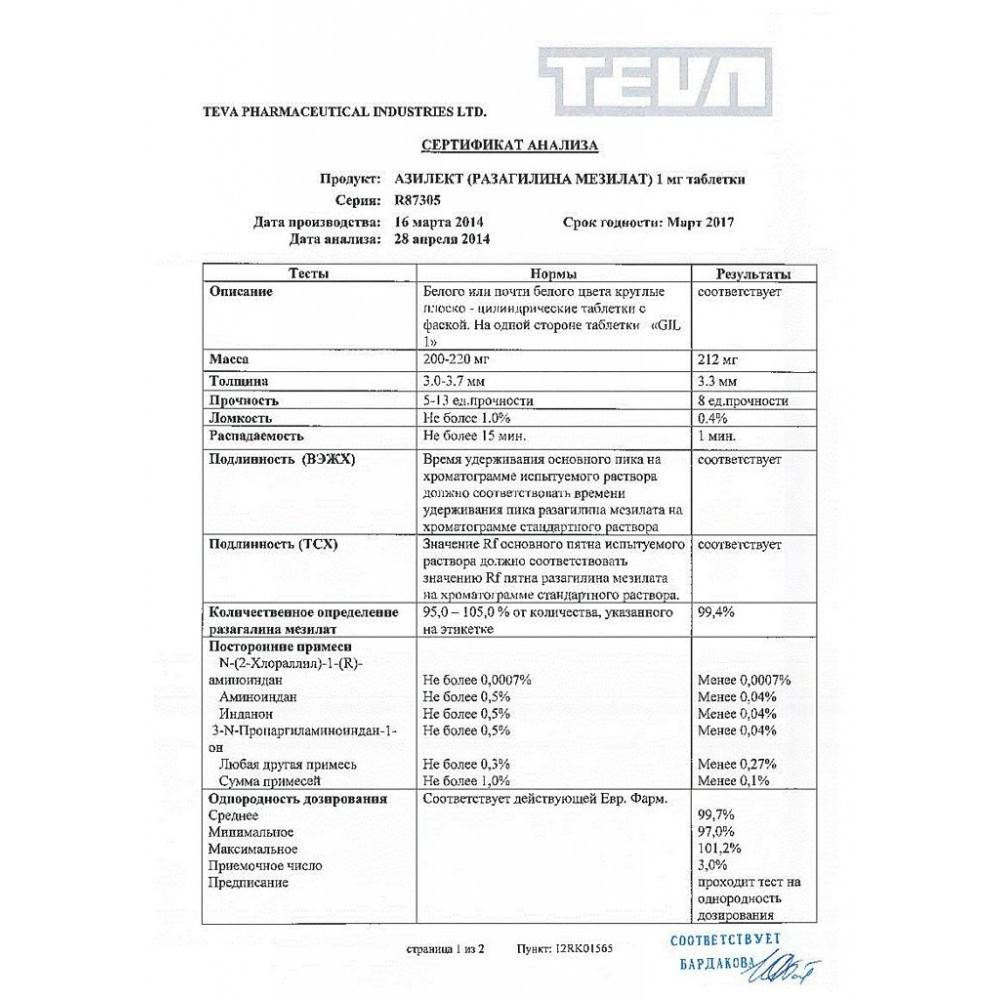 Применение. Таблетки Азилект принимают внутрь, независимо от приема пищи, в дозе 1 мг 1 раз в сутки как при монотерапии, так и в комбинации с леводопой.