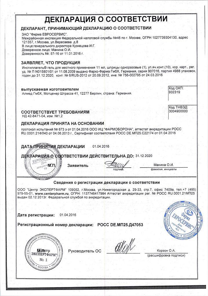Инстиллагель выпускается в форме прозрачного, почти бесцветного, вязкого геля для местного применения. В 100 мл лекарственного препарата содержится 2 г лидокаина и 0,05 г хлоргексидина. Гель расфасован в одноразовые шприцы по 6 или 11 мл. Каждый шприц помещен в блистер. Одна упаковка содержит 10 блистеров.