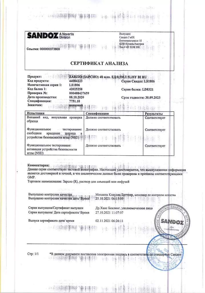 Препарат Зарсио выпускается в следующих дозах: 30 млн ЕД/0,5 мл (0,3 мг) и 48 млн ЕД/0,5 мл (0,48 мг).