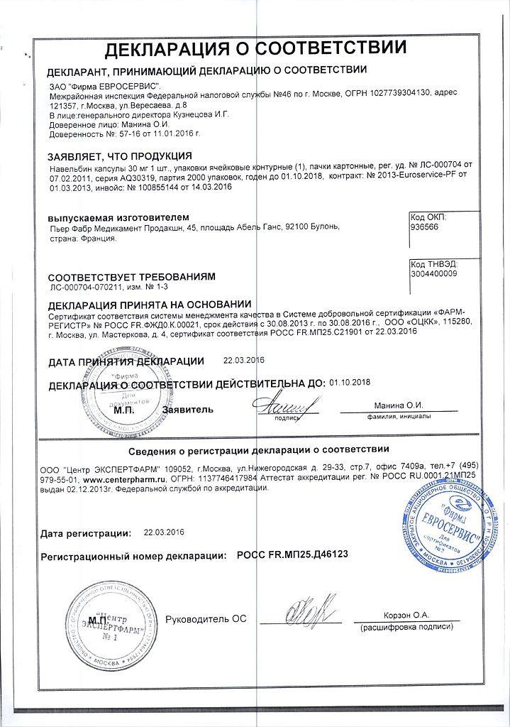 1 капсула Навельбин содержит: винорелбина тартрат (винорелбина основание) 27,7 (20) мг 41,55 (30) мг.