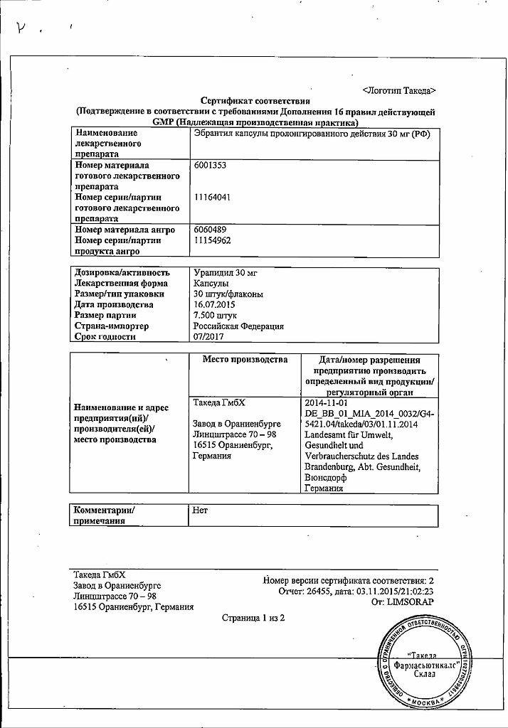 Для постепенного снижения артериального давления рекомендуется начинать лечение с 30 мг Эбрантила два раза в день. Если необходимо добиться более быстрого снижения артериального давления, лечение можно начать с 60 мг два раза в день. Дозу можно постепенно корректировать в соответствии с индивидуальными потребностями пациента. Поддерживающая доза составляет 60–180 мг урапидила в сутки в 2 приема.