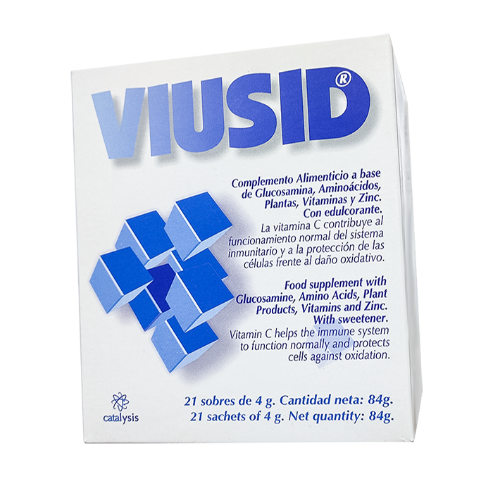 1 пакетик Виусид содержит: активные вещества: кислота глицирризиновая 46,9 мг, глюкозамин 690 мг, аргинин 720 мг, глицин 393 мг, кислота аскорбиновая 43 мг, пиридоксина гидрохлорид 0,59 мг, кальция пантотенат 2,2 мг, кислота фолиевая 0,068 мг, цианокобаламин 0,000395 мг, кислота яблочная 704 мг, цинка сульфат 5мг.Вспомогательные вещества: мальтодекстрин (мальтитол), ароматизатор лимонный (Brasil 162 А), ароматизатор мятный (R 200 AN) натрия метилпарабен (Е219), неогесперидин, камедь гуаровая.