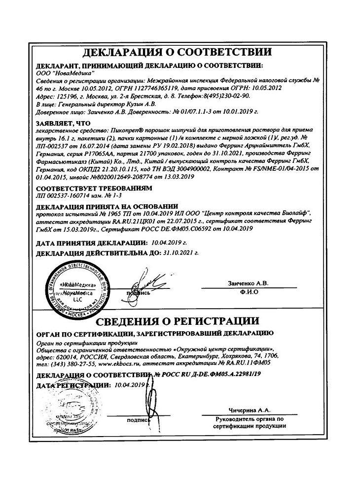 Особые указания. Период подготовки к очищению кишечника не должен превышать 24 часа, более долгий период увеличивает риск нарушения водно-электролитного баланса. Пикопреп содержит гидрокарбонат калия, что должно учитываться у пациентов с низкокалорийной диетой.